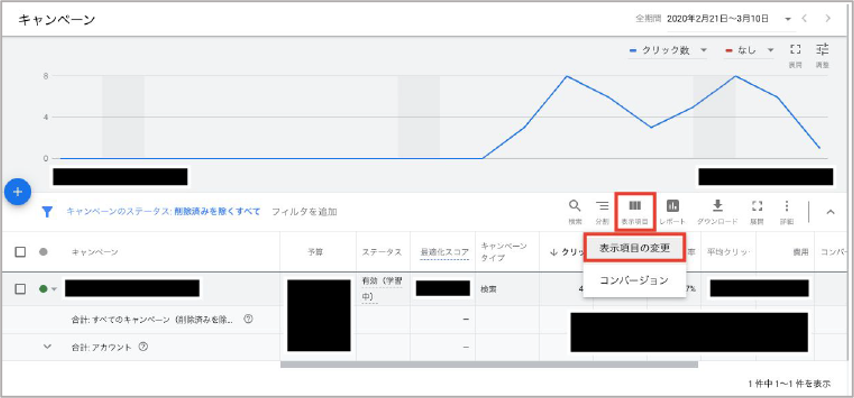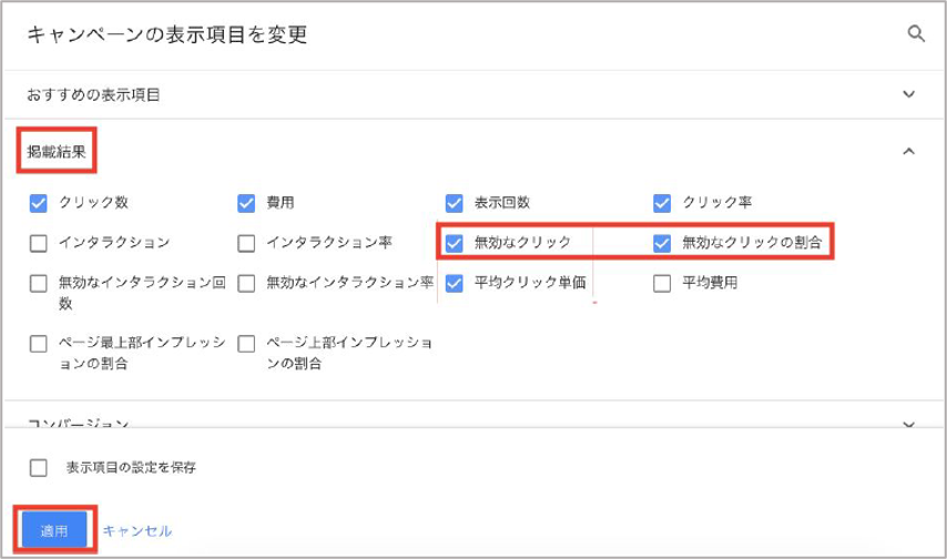 「掲載結果」をクリックして、「無効なクリック」「無効なクリックの割合」という項目にチェックを入れて、「適用」を選択します。