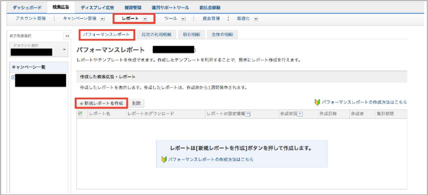 「レポート」をクリックした後、「パフォーマンスレポート」を選択しましょう。