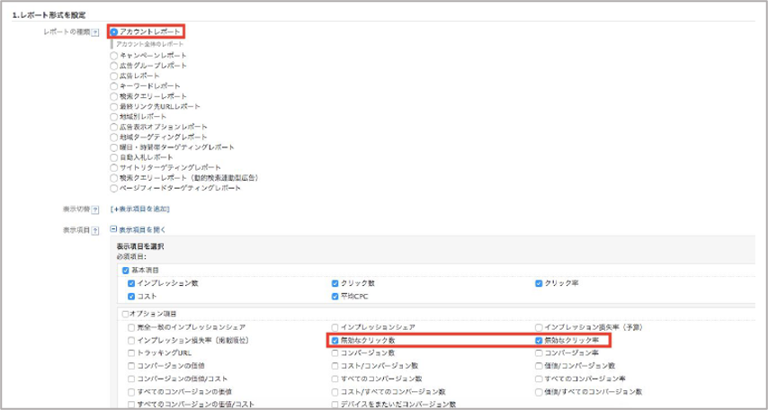 「表示項目を開く」から、「無効なクリック数」と「無効なクリック率」をチェックし、「作成」を押しましょう。