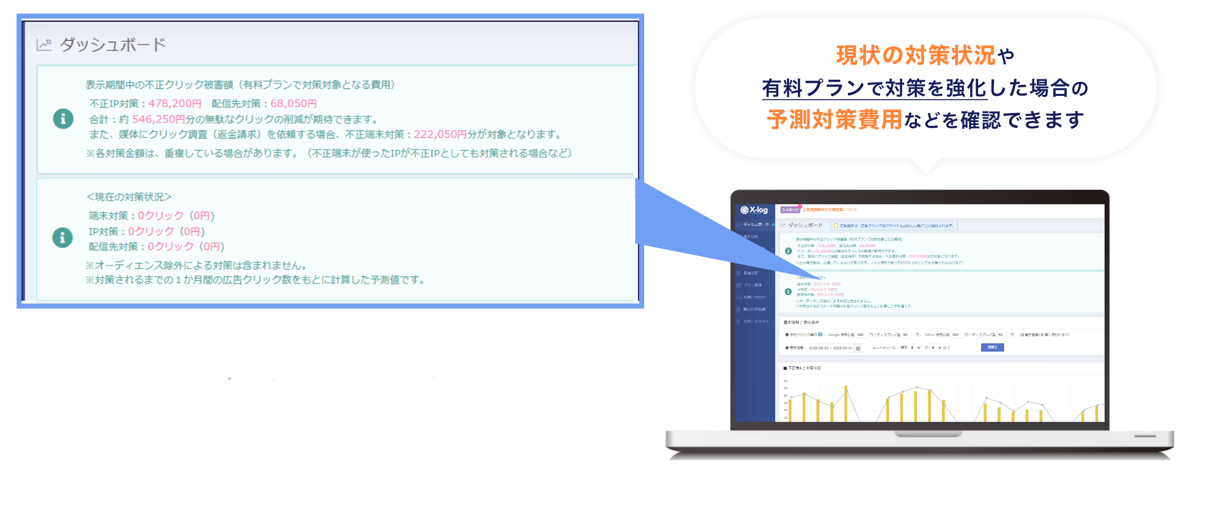 - Freeプラン:月10万PV以上の方は、どのくらい不要なクリックがあるか、一定期間のみ解析できます。